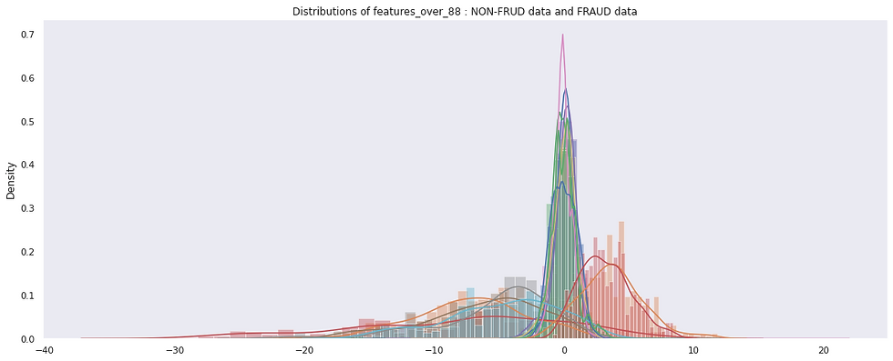 This is the supervised plot of the first subset, with only 5 most informative features with AUC > 0.9. There is an apparent contrast between the distributions of the FRAUD (short and wide) and the NON-FRAUD (tall and narrow) distributions. In high level, it looks like there are about 2 to 3 different Gaussians for FRAUD cases and about 1 to 2 different Gaussians for NON-FRAUD cases. that have greater variance than NON-FRAUD cases. It's also important to note that FRAUD data distribution is wider, meaning that it has greater variance. This confirms our assumption that the small amount of FRAUD transactions (0.17% of data) are OUTLIERS, which perform a greater variety of "non-conventional" behaviours.